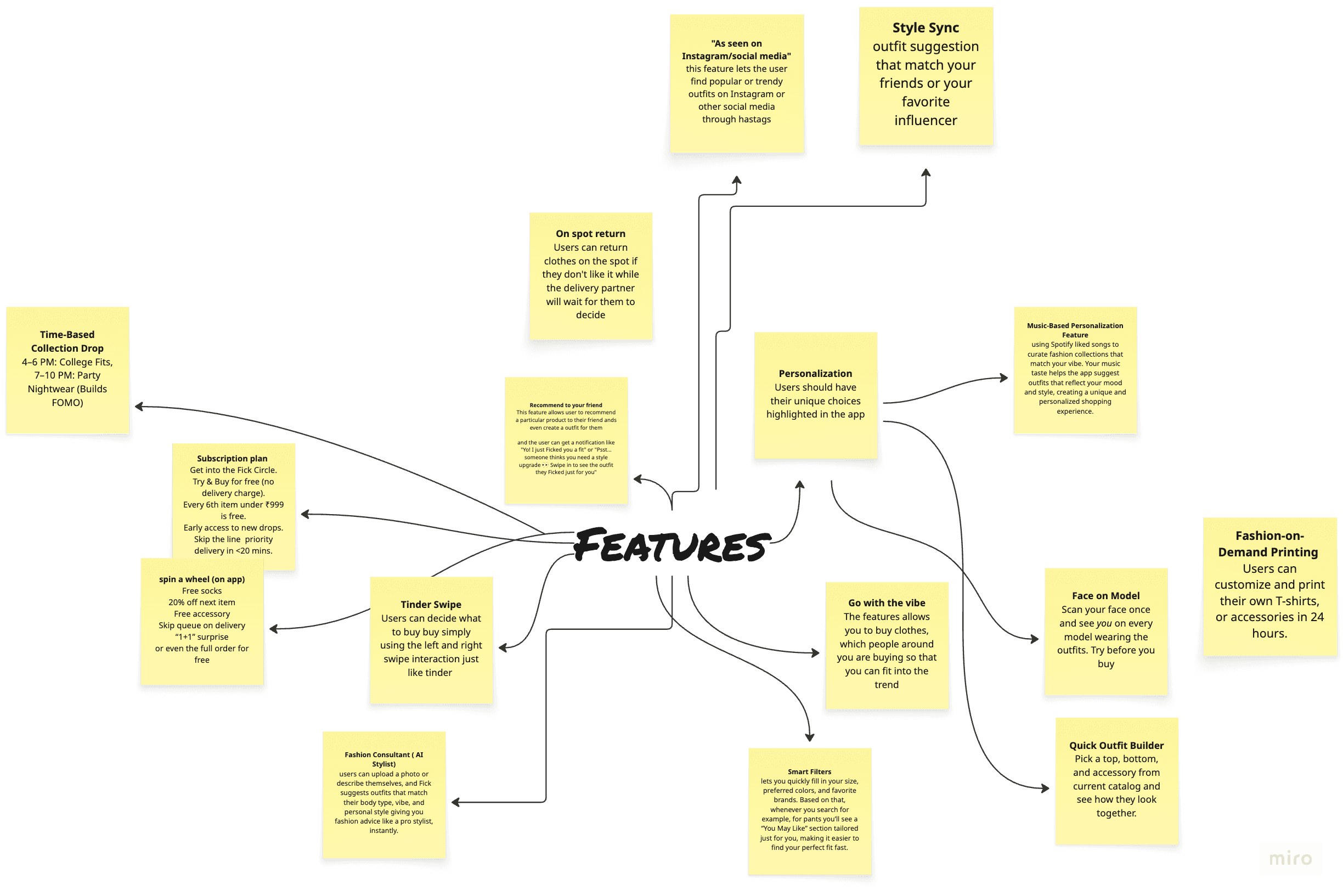 We started by putting every idea on the table—fun, practical, chaotic. Sticky notes filled with quick thoughts like Try & Buy, Outfit Randomizer, Personalized Search, and Local Trend Boards helped us see what the next version of the product could become.